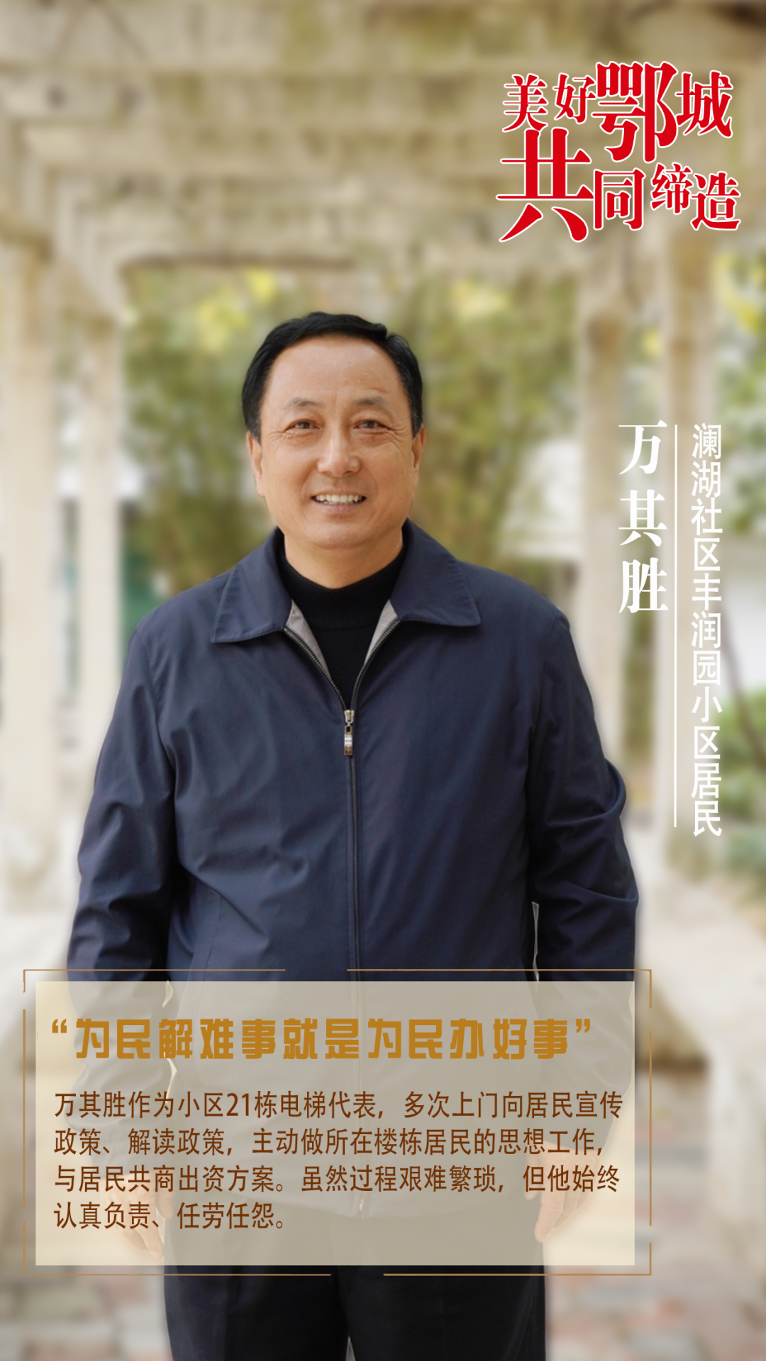 萬其勝作為小區(qū)21棟電梯代表,多次上門向居民宣傳政策、解讀政策,主動做所在樓棟居民的思想工作,與居民共商出資方案。雖然過程艱難繁瑣,但他始終認(rèn)真負(fù)責(zé)、任勞任怨。