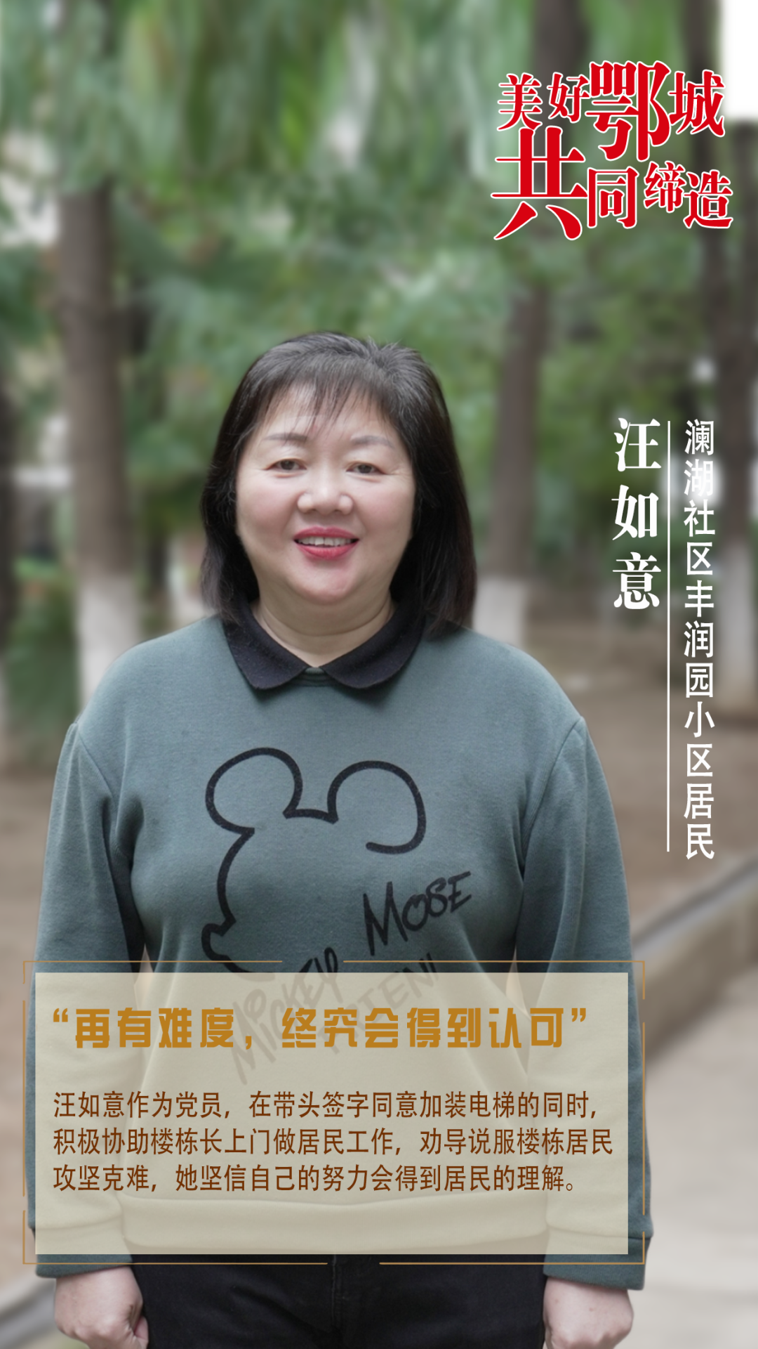 汪如意作為黨員,在帶頭簽字同意加裝電梯的同時,積極協(xié)助樓棟長上門做居民工作,勸導(dǎo)說服樓棟居民攻堅克難,她堅信自己的努力會得到居民的理解。