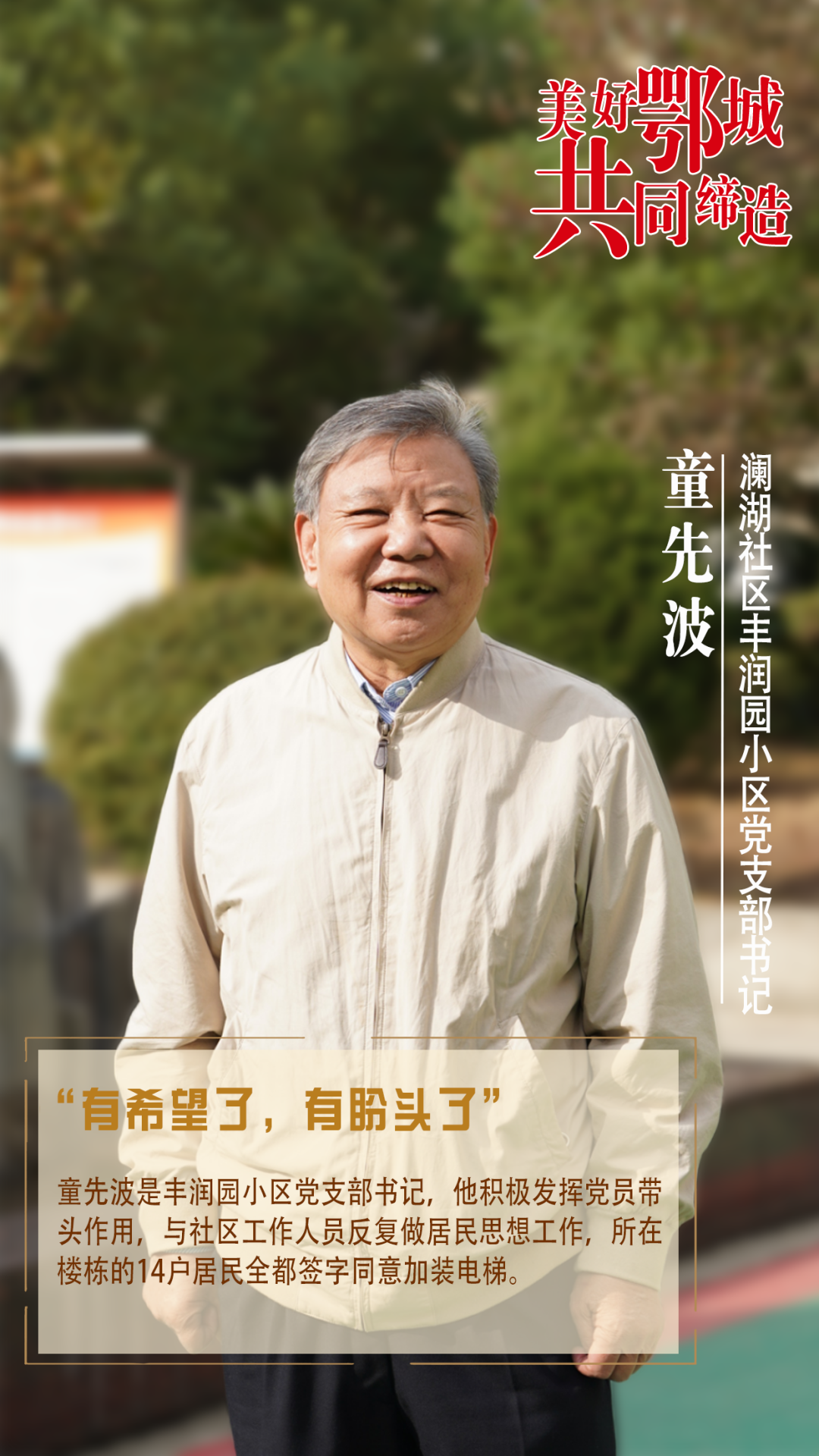 童先波是豐潤園小區(qū)黨支部書記,他積極發(fā)揮黨員帶頭作用,與社區(qū)工作人員反復(fù)做居民思想工作,所在樓棟的14戶居民全都簽字同意加裝電梯。