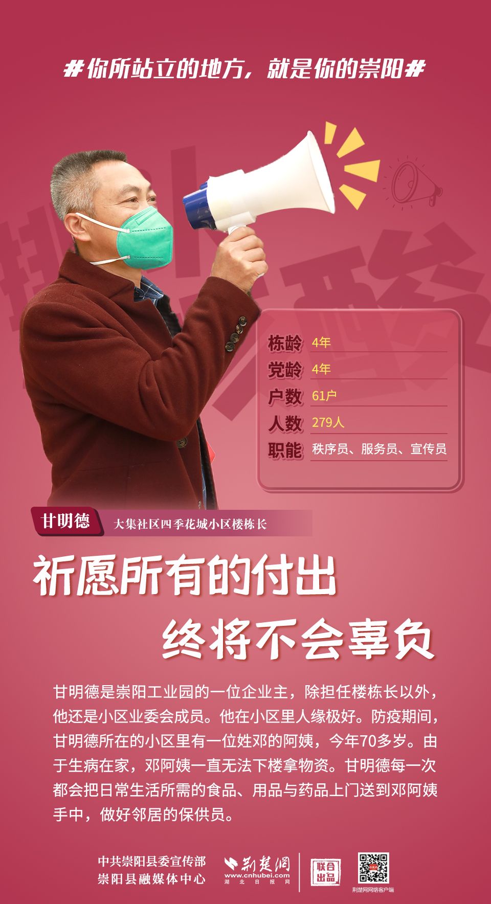 崇陽疫情正處于吃勁關(guān)口,你所站立的地方就是你的崇陽;你怎么樣,崇陽便怎么樣;你是什么,崇陽便是什么;你積極,崇陽就不消極;你熱情,崇陽就不冷淡;你有光明,崇陽便不再黑暗。疫情面前,沒有“看客”,更沒有“局外人”,致敬每一位宅家抗疫的你!