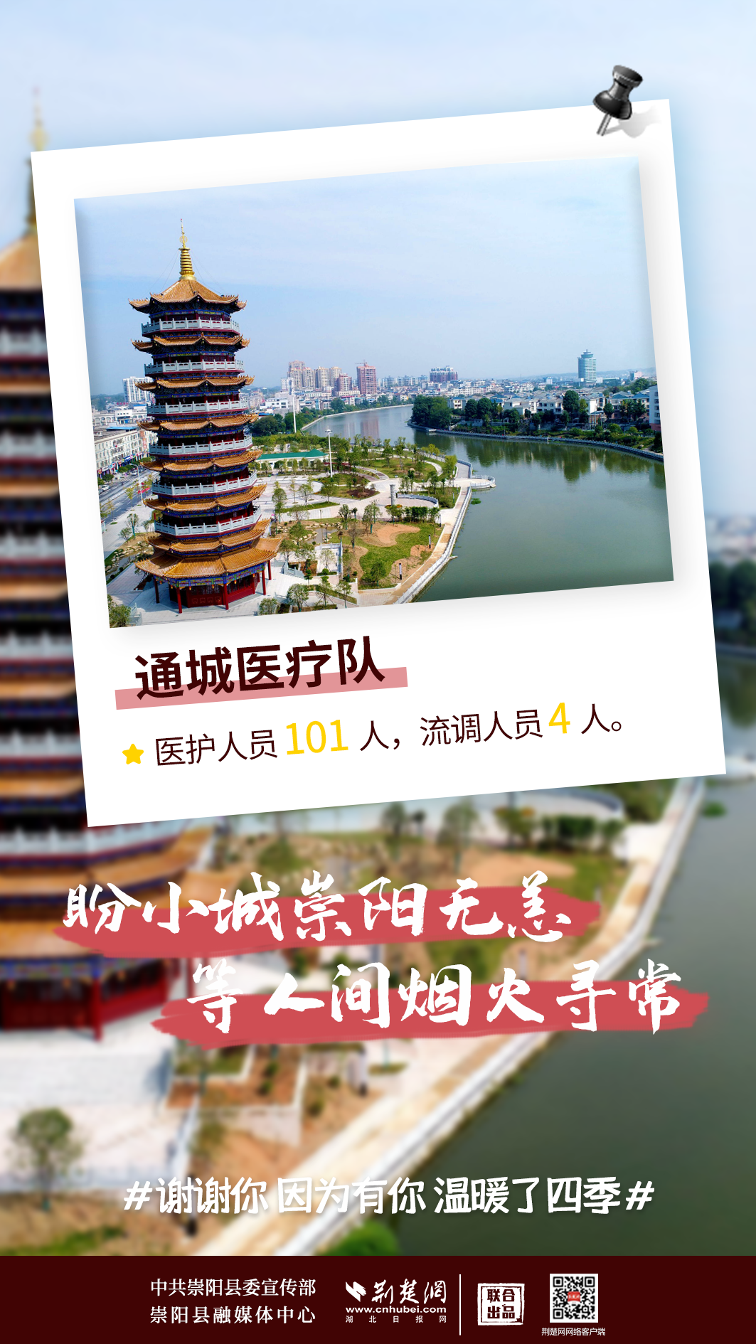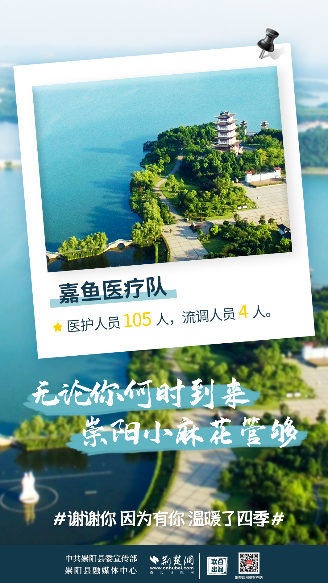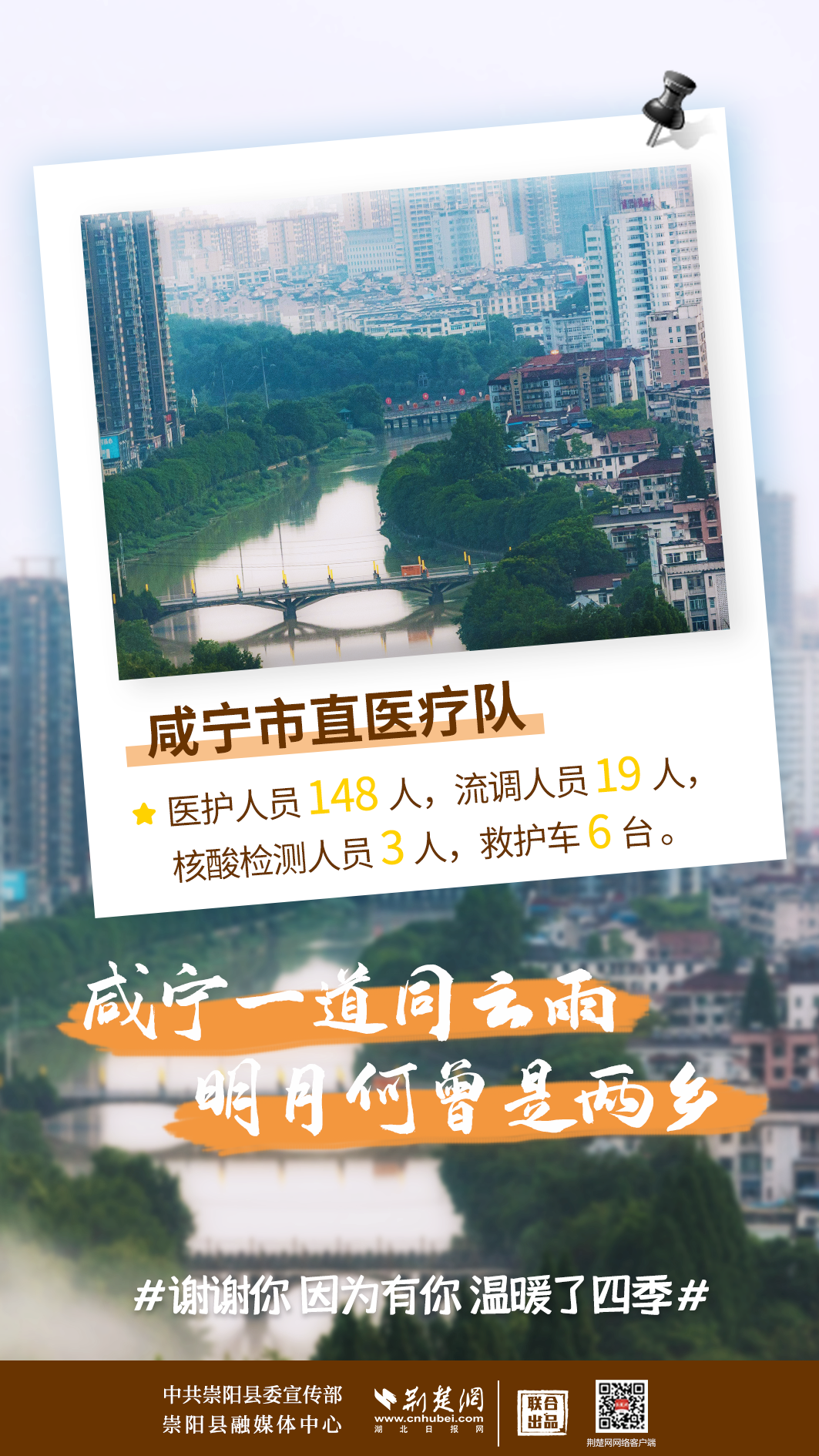 修我甲兵,與子偕行。在崇陽縣疫情防控形勢最嚴峻、最艱難的時刻,來自咸寧市直、通山縣、通城縣、嘉魚縣4支醫(yī)療隊,489名醫(yī)務人員,火速支援崇陽抗疫,馬不卸鞍,人不解甲,便同51萬崇陽人民一道相守偕行,并肩作戰(zhàn)。