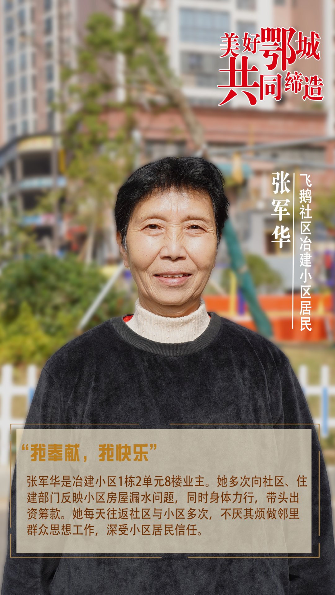 張軍華是冶建小區(qū)1棟2單元8樓業(yè)主。她多次向社區(qū)、住建部門反映小區(qū)房屋漏水問題,同時(shí)身體力行,帶頭出資籌款。她每天往返社區(qū)與小區(qū)多次,不厭其煩做鄰里群眾思想工作,深受小區(qū)居民信任。