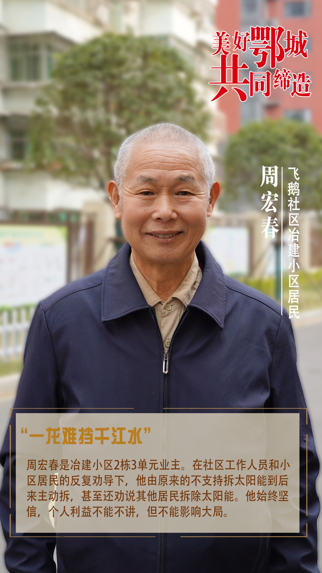 周宏春是冶建小區(qū)2棟3單元業(yè)主。在社區(qū)工作人員和小區(qū)居民的反復(fù)勸導(dǎo)下,他由原來的不支持拆太陽能到后來主動(dòng)拆,甚至還勸說其他居民拆除太陽能。他始終堅(jiān)信,個(gè)人利益不能不講,但不能影響大局。