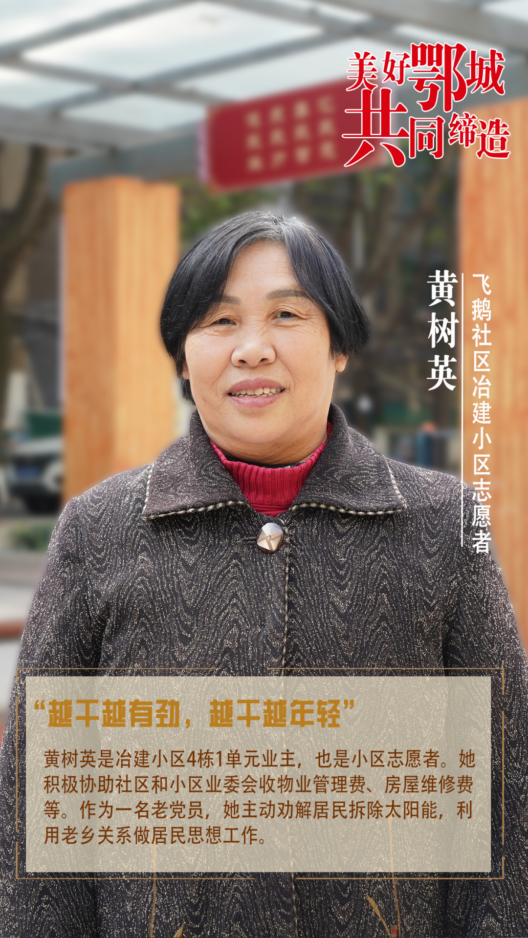 黃樹英是冶建小區(qū)4棟1單元業(yè)主,也是小區(qū)志愿者。她積極協(xié)助社區(qū)和小區(qū)業(yè)委會(huì)收物業(yè)管理費(fèi)、房屋維修費(fèi)等。作為一名老黨員,她主動(dòng)勸解居民拆除太陽能,利用老鄉(xiāng)關(guān)系做居民思想工作。