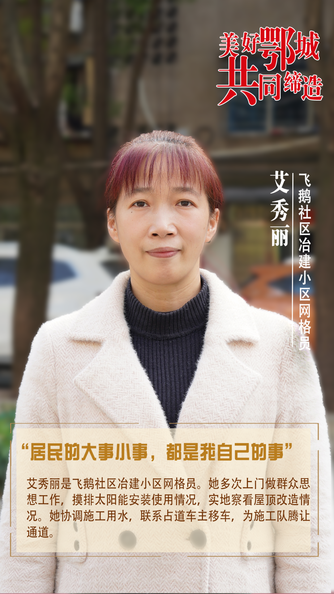 艾秀麗是飛鵝社區(qū)冶建小區(qū)網(wǎng)格員。她多次上門做群眾思想工作,摸排太陽能安裝使用情況,實(shí)地察看屋頂改造情況。她協(xié)調(diào)施工用水,聯(lián)系占道車主移車,為施工隊(duì)騰讓通道。