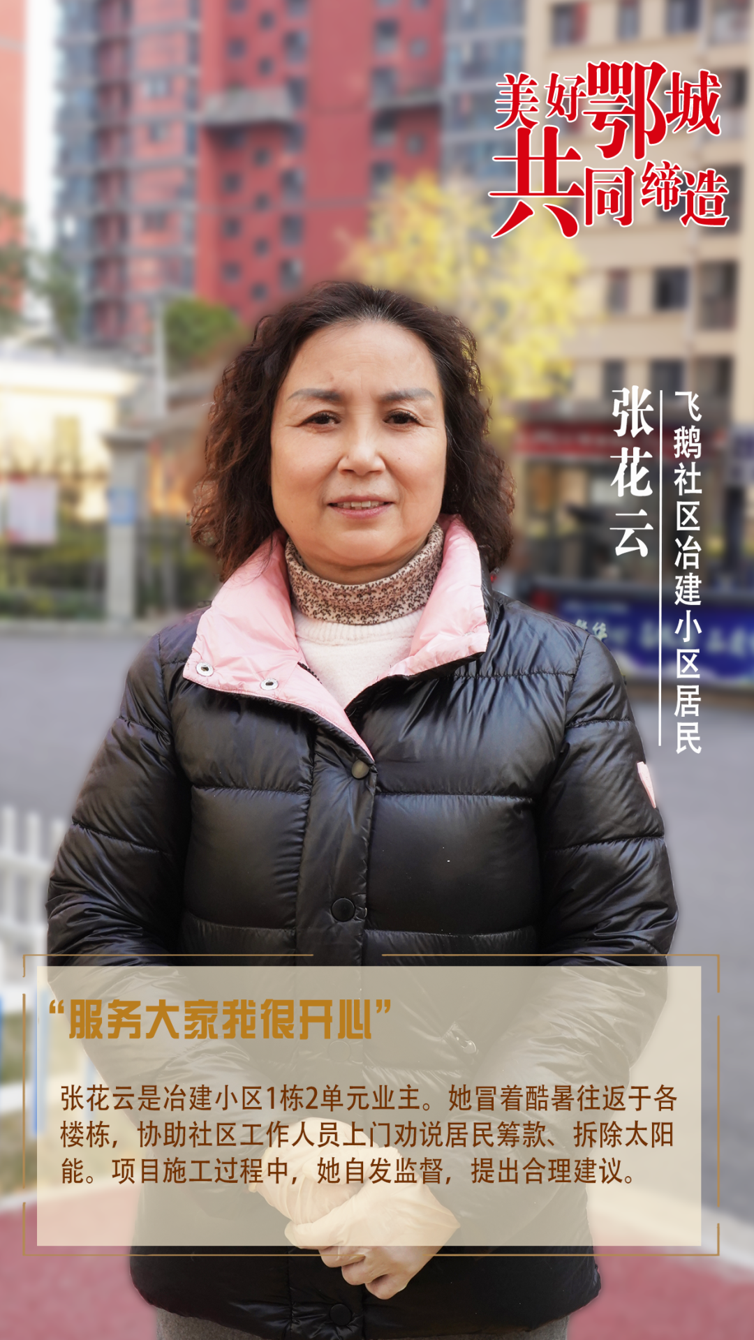 張花云是冶建小區(qū)1棟2單元業(yè)主。她冒著酷暑往返于各樓棟,協(xié)助社區(qū)工作人員上門勸說居民籌款、拆除太陽能。項(xiàng)目施工過程中,她自發(fā)監(jiān)督,提出合理建議。