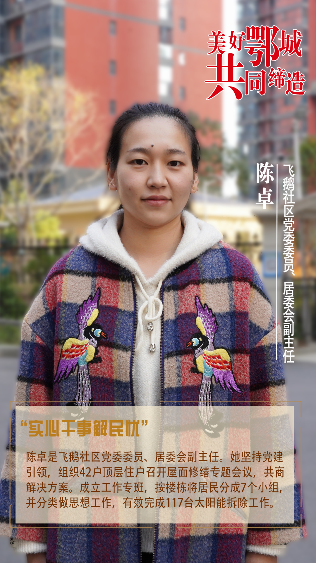 陳卓是飛鵝社區(qū)黨委委員、居委會(huì)副主任。她堅(jiān)持黨建引領(lǐng),組織42戶頂層住戶召開屋面修繕專題會(huì)議,共商解決方案。成立工作專班,按樓棟將居民分成7個(gè)小組,并分類做思想工作,有效完成117臺(tái)太陽能拆除工作。