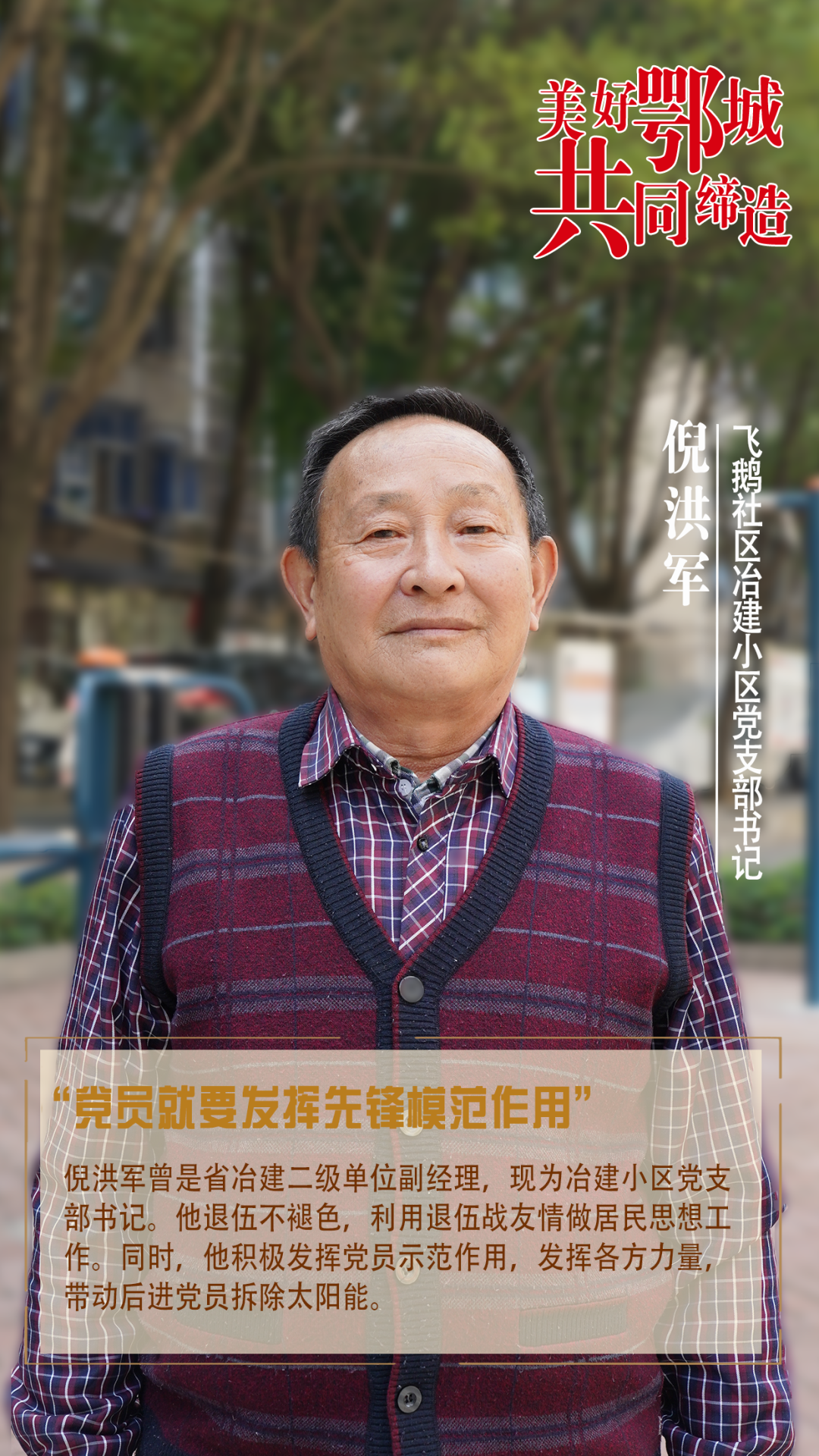 倪洪軍曾是省冶建二級(jí)單位副經(jīng)理,現(xiàn)為冶建小區(qū)黨支部書記。他退伍不褪色,利用退伍戰(zhàn)友情做居民思想工作。同時(shí),他積極發(fā)揮黨員示范作用,發(fā)揮各方力量,帶動(dòng)后進(jìn)黨員拆除太陽能。