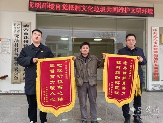 荊楚網(wǎng)(湖北日?qǐng)?bào)網(wǎng))訊(通訊員 耿文輝 趙兆)“老兵調(diào)解真得力,鎮(zhèn)村聯(lián)動(dòng)解民憂”“檢察聽證解心結(jié),監(jiān)督有力暖人心”,12月27日,信訪戶董某甲將兩面錦旗分別送給武穴市人民檢察院和武穴市花橋鎮(zhèn)饒垴村綜治中心。