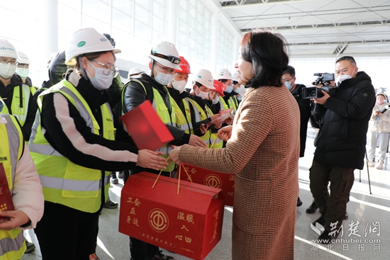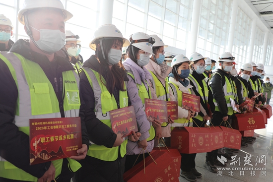 在鄂州花湖機(jī)場航站樓一樓大廳,現(xiàn)場氣氛熱烈,上午9時(shí),鄂州市總工會(huì)為乘機(jī)返鄉(xiāng)的首批60名建設(shè)者代表贈(zèng)送飛機(jī)票和年貨禮包,讓春節(jié)回家路更加溫暖、舒心、便捷。