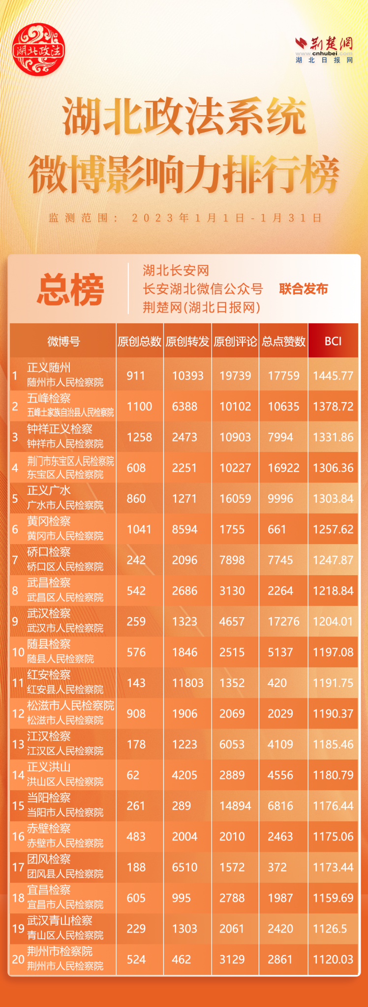 湖北政法系統(tǒng)681個(gè)頭條帳號(hào)參加評(píng)選,其中政法委系統(tǒng)123個(gè)、法院系統(tǒng)128個(gè)、檢察系統(tǒng)130個(gè)、公安系統(tǒng)141個(gè)、司法系統(tǒng)159個(gè)?!伴L安黃梅”、“法治大別山”、“長安武穴”、“黃岡交警”、“英山特警”5家單位強(qiáng)勢上榜,分別排名第5位、第11位、12位、17位、19位。