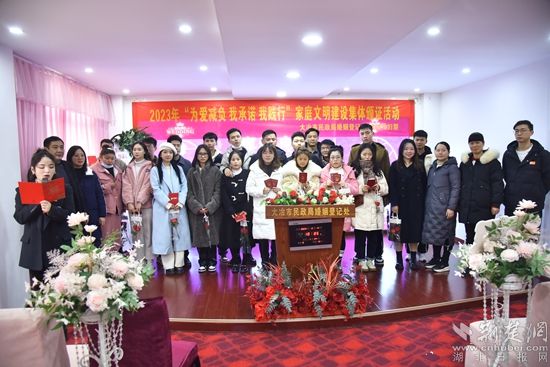 荊楚網(wǎng)(湖北日報網(wǎng))訊(通訊員 杜巧云、石姣、陳?。?/strong>“我承諾:抵制高價彩禮,為愛減負(fù),拒絕低俗婚鬧,為愛守禮,主張婚事簡辦,為愛啟航,傳承優(yōu)秀文化,為愛踐行……”2月14日上午,大冶市婚姻登記處為當(dāng)日上午登記領(lǐng)證的50對新人舉行“為愛減負(fù),我承諾、我踐行”集體頒證活動,新人們在這個特殊的日子集體宣誓并在《婚俗改革倡議書》上簽字承諾。