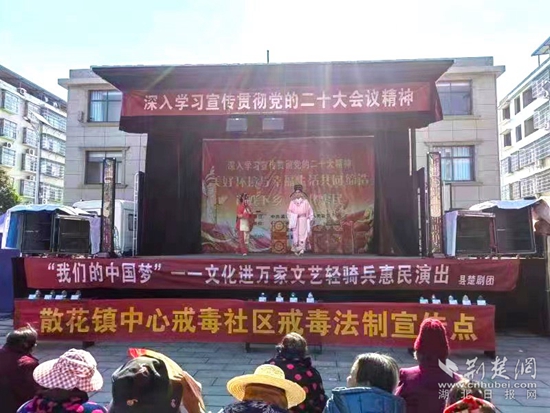 當天,浠水縣楚劇團到該村開展送戲下鄉(xiāng)活動,現(xiàn)場群眾絡繹不絕,浠水縣公安局禁毒大隊聯(lián)合散花鎮(zhèn)中心戒毒社區(qū)借活動演出時機,在現(xiàn)場開展毒品預防宣傳教育活動,共發(fā)放宣傳資料200余份,解答相關咨詢30余人。