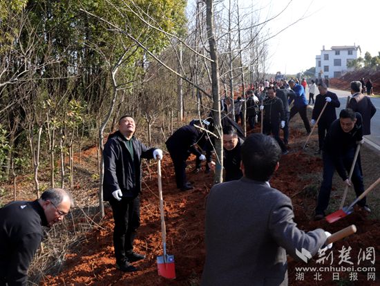 2月27日,在S360省道官埠段,春日暖陽(yáng),綠意盎然。咸寧市和咸安區(qū)200余名黨員干部正在揮揪植樹(shù),1300棵株樹(shù)、香楓、紅櫸立馬成行,夾道迎賓。干群熱火朝天的干勁,恰似春風(fēng)撲面。