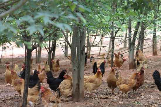 走在梓沐家庭農(nóng)場里,綠樹成蔭,微風習習?!斑@是茶梅路,那邊一條是桂花路,中間種的是三角楓,桂花路另一邊是樸樹以及一些果樹?!蓖踔窃竭呑哌吔榻B,農(nóng)場充分利用空間發(fā)展林下經(jīng)濟,單獨劃分區(qū)域,在樹下放養(yǎng)雞鴨共計1000余只。