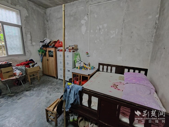 一張簡陋的木床、一個簡易拼裝的衣柜、一個老舊的木柜,就是胡新苗的房間。