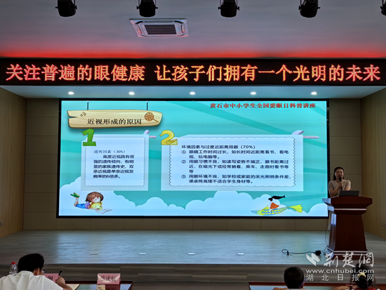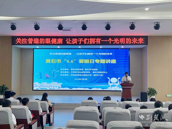 當(dāng)天,由黃石市教育局、黃石市衛(wèi)健委主辦,開發(fā)區(qū)·鐵山區(qū)教育局承辦的“6·6全國愛眼日——關(guān)注普遍的眼健康”科普教育講座活動,在黃金山第四小學(xué)舉行。