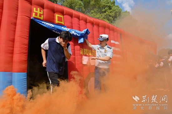 伴隨著陣陣緊促的警笛聲在校園響起,一教室內(nèi)“電線短路”,引燃桌面書籍,頓時濃煙滾滾?!罢埜魑煌瑢W不要驚慌,捂住口鼻、低頭彎腰、貼墻往樓下有效進行疏散......”廣播中傳來疏散指令,消防員指導全體師生從“安全出口”有序迅速撤離,通過體驗“生命通道”,使師生掌握火場疏散逃生技能。