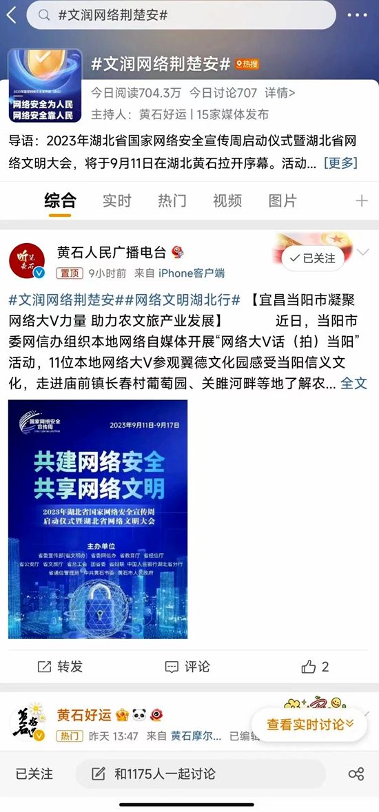 荊楚網(wǎng)(湖北日報(bào)網(wǎng))訊(記者 呂鑒蕾 通訊員 黃旺宣)2023年湖北省國家網(wǎng)絡(luò)安全宣傳周啟動(dòng)儀式暨湖北省網(wǎng)絡(luò)文明大會開幕在即。連日來,圍繞“文潤網(wǎng)絡(luò)荊楚安”“網(wǎng)絡(luò)文明湖北行”等話題,社交平臺上開啟了“湖北接力”。