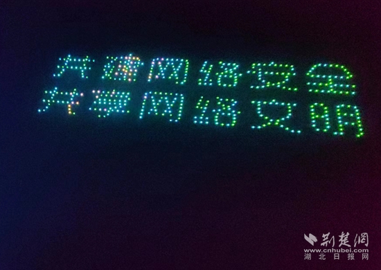 夜空中,數(shù)百架無人機(jī)以天空為畫布、以光影為畫筆,描繪出一幅幅科技與視覺的“大片”。表演融入網(wǎng)絡(luò)視聽元素和黃石、湖北地標(biāo)內(nèi)容,依次幻化成小燕子、天空之城、黃石歡迎你、地球、安全盾牌等11個(gè)畫面,最終匯集成“共建網(wǎng)絡(luò)安全 共享網(wǎng)絡(luò)文明”的字樣。