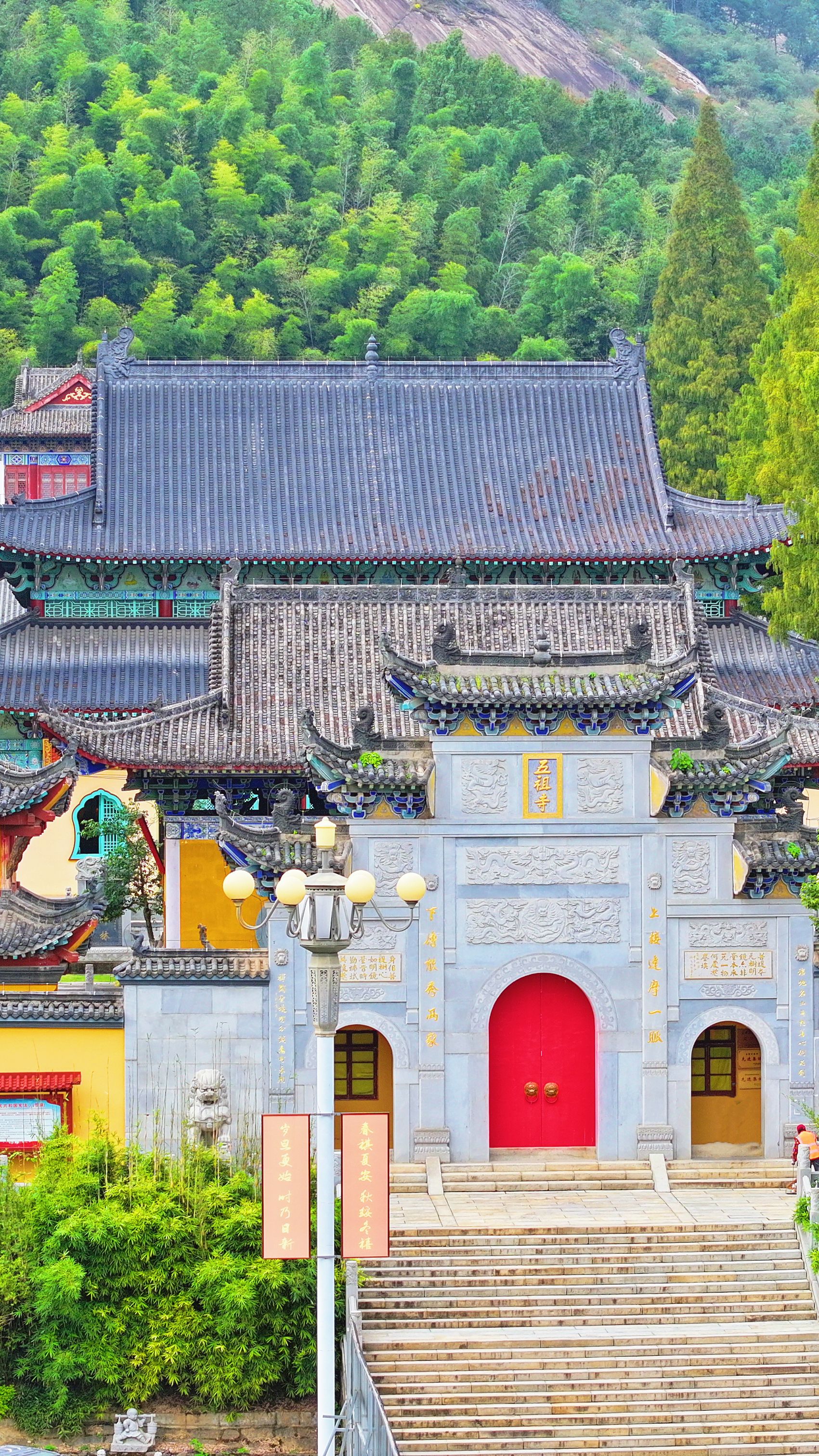 終點(diǎn)處山門(mén),是古代通往五祖寺的必經(jīng)之路。古山門(mén)始建于唐大中年間,迄今1100年歷史。山門(mén)用青麻石柳筑而成,為城樓式,古樸典雅,莊重大方。