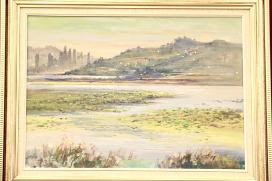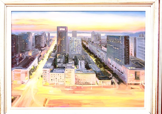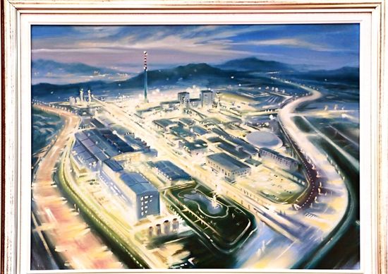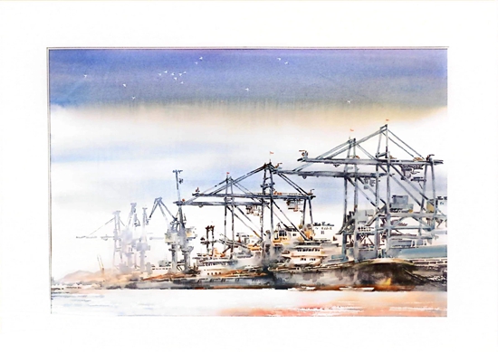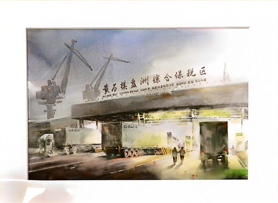 第一幅畫(huà),展示的是數(shù)只船舶在新港碼頭裝卸貨物的繁華景象。第二幅畫(huà),卡車(chē)進(jìn)入棋盤(pán)洲綜合保稅區(qū)外卡口的實(shí)景記錄。第三幅畫(huà),描繪的是園區(qū)夜間工廠燈火通明、24小時(shí)生產(chǎn)不停的場(chǎng)景。第四幅畫(huà),以綠色為底色,展示的是人與自然和諧共生的美景。第五幅畫(huà),描繪的是棠梨湖商業(yè)街的街景。