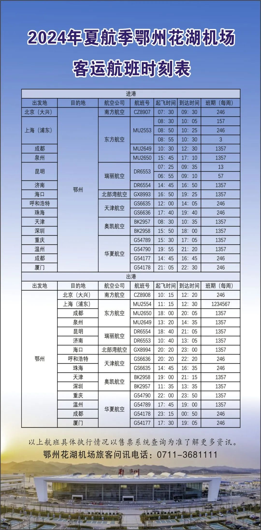 華夏航空新開成都—鄂州—廈門航線。去程:成都14:45—16:45鄂州,鄂州17:30—19:05廈門;回程:廈門21:05—22:30鄂州,鄂州23:15—00:50成都(+1)。具體執(zhí)飛信息以航空公司實(shí)際執(zhí)行為準(zhǔn)。