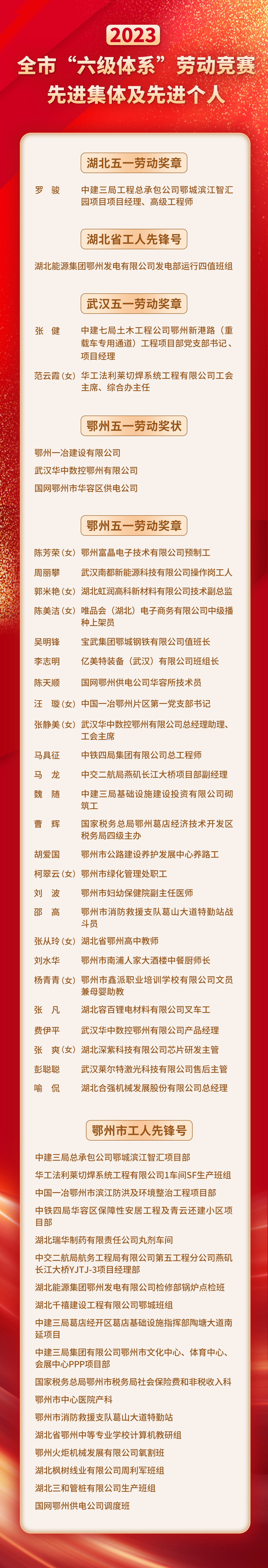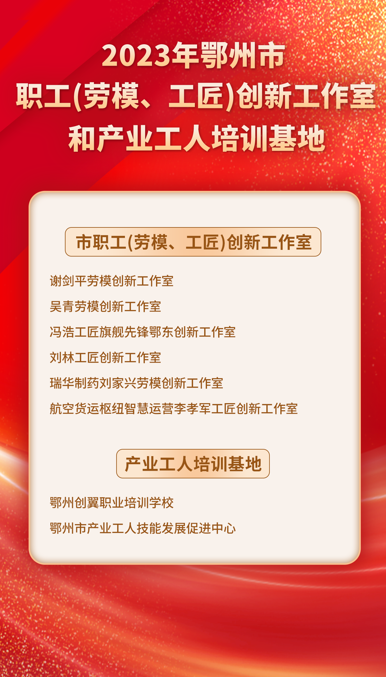 4月22日上午,在2024年鄂州市雙“百千萬”勞動和技能競賽啟動式上,鄂州公布2023年全市“六級體系”勞動競賽先進集體及先進個人名單,并公布2023年鄂州市職工(勞模、工匠)創(chuàng)新工作室和產(chǎn)業(yè)工人培訓(xùn)基地。