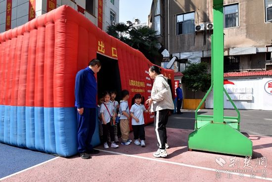 在操場,消防員指導(dǎo)小朋友試穿“滅火戰(zhàn)斗服”、佩戴消防頭盔、體驗火場逃生帳篷,詳細講解火災(zāi)事故的危險性以及如何正確撥打火警電話、火場逃生自救方法等消防安全知識,讓小朋友們對火災(zāi)有了更深刻地認識。