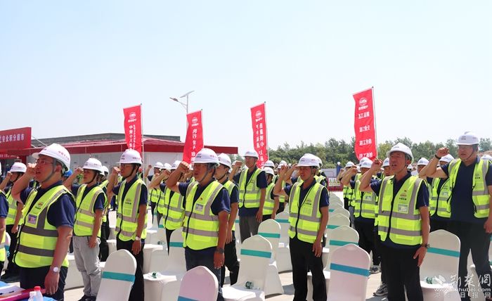 “我是一名光榮的建設(shè)者,面對鮮紅旗幟,莊嚴(yán)宣誓: 快速制勝,安全至上,只爭朝夕創(chuàng)高產(chǎn);精細(xì)管理 創(chuàng)譽(yù)創(chuàng)效,銳意進(jìn)取提質(zhì)效;勇當(dāng)標(biāo)桿,建造精品,實(shí)干興企爭一流。我鄭重承諾……堅(jiān)決做到……”建設(shè)者們的眼中閃爍著堅(jiān)定的光芒,現(xiàn)場的氣氛被這一番誓言推向了高潮。