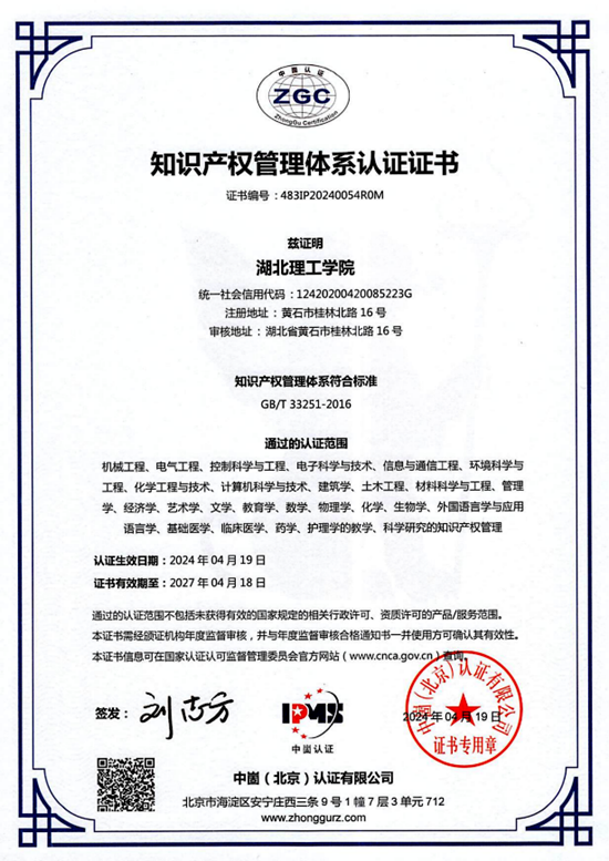 荊楚網(wǎng)(湖北日?qǐng)?bào)網(wǎng))訊(記者 呂鑒蕾 通訊員 張凡)記者7日從湖北理工學(xué)院獲悉,該校成功通過了由國(guó)家知識(shí)產(chǎn)權(quán)局、教育部和中國(guó)標(biāo)準(zhǔn)化研究院聯(lián)合編制的《高等學(xué)校知識(shí)產(chǎn)權(quán)管理規(guī)范》(GB/T33251-2016)國(guó)家標(biāo)準(zhǔn)審核認(rèn)證,取得了《知識(shí)產(chǎn)權(quán)管理體系認(rèn)證證書》。