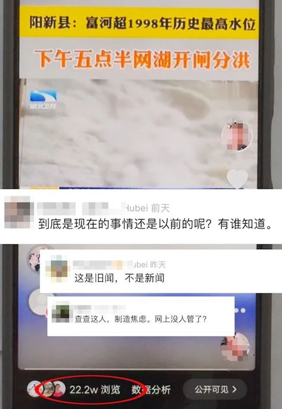 該視頻一經(jīng)發(fā)布,立即引起了廣大網(wǎng)民的關(guān)注和擔憂,誤導(dǎo)網(wǎng)民認為發(fā)生了洪災(zāi)險情。相關(guān)視頻發(fā)布后瀏覽量達22.2萬人次,在一定程度上引發(fā)了公眾恐慌。
