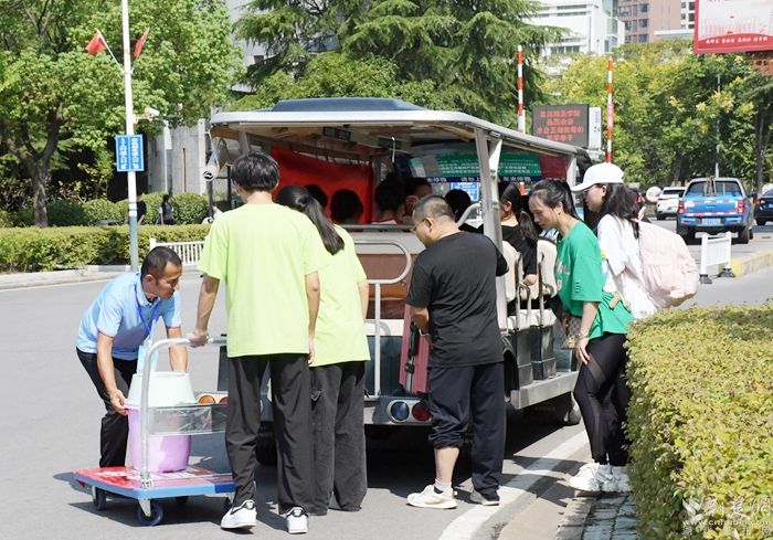 完成報(bào)到手續(xù)后,新學(xué)子們帶上行李,乘坐觀光車直達(dá)宿舍,同時(shí),也開啟了他們的校園探索之旅。記者發(fā)現(xiàn),這些校車觀光車不僅外觀新穎、內(nèi)飾舒適,司機(jī)還饒有興致地為新學(xué)子們?cè)敿?xì)介紹校園的歷史沿革、建筑風(fēng)格、教學(xué)設(shè)施以及各個(gè)學(xué)院的特色。