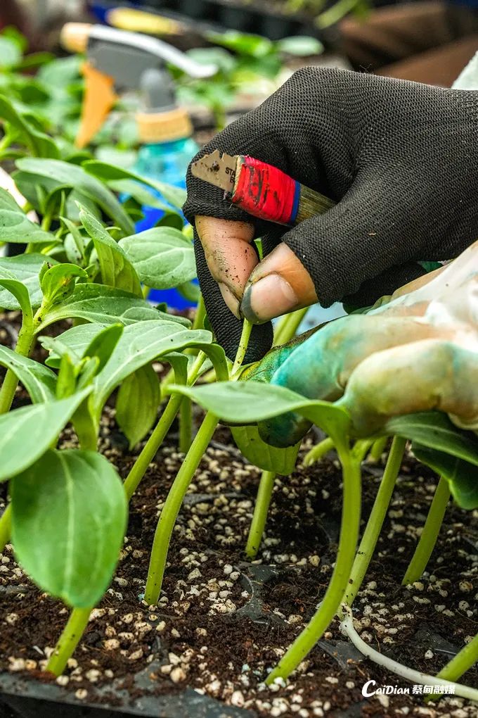 廣西 “女子嫁接隊” 帶頭人梁麗麗率姐妹去年12月底扎根基地開展嫁接。只見她熟練地掐掉瓜芯,用專業(yè)的自制刀具斜切掉西瓜接穗苗的根部,再迅速將其插入頂端葫蘆砧木,整個過程行云流水,不到6秒就能完成一株西瓜苗的嫁接。她表示:“我們是12月25日過來的,一共11個姐妹,每天嫁接6萬株,150萬株西瓜苗能在春節(jié)前全部嫁接完成。”