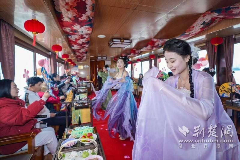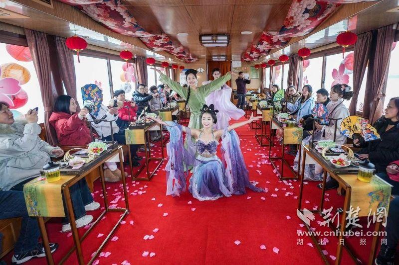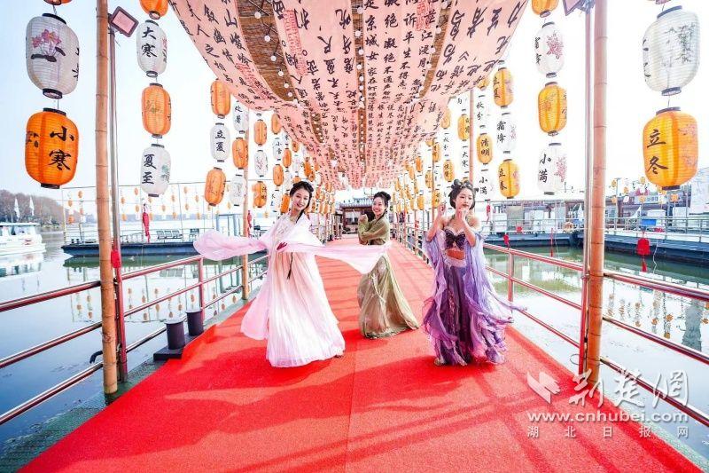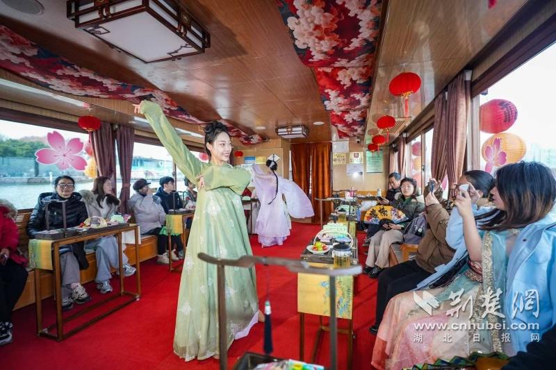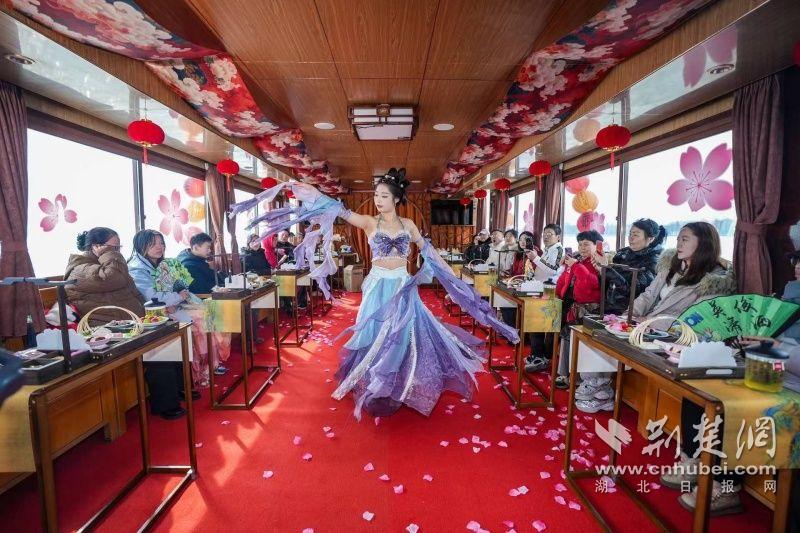 據(jù)介紹,全新上線的精品環(huán)湖游將為游客帶來沉浸式國風(fēng)演藝體驗,從楚風(fēng)園碼頭出發(fā),在游客登船之際,精彩好戲就已正式開鑼。畫舫離岸,演出開始,《元夕》《一面驚鴻》《錦瑟》等國風(fēng)舞蹈亮相甲板,表演者們霓裳蹁躚,或婉約柔美,或英氣颯爽,在游客面前隨著悠揚楚樂,將楚舞的神韻演繹得絲絲入扣,不時還與游客隨機(jī)互動,同賀新春。