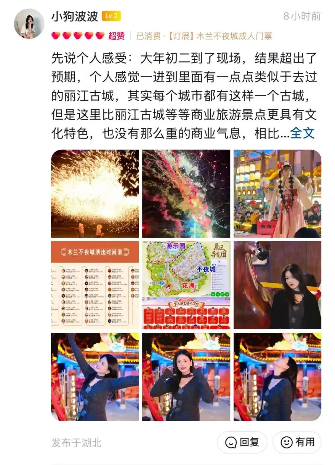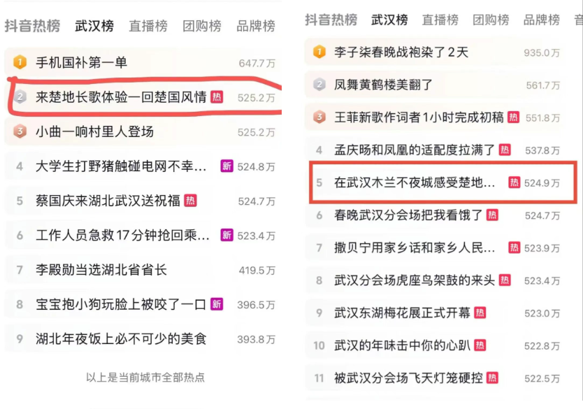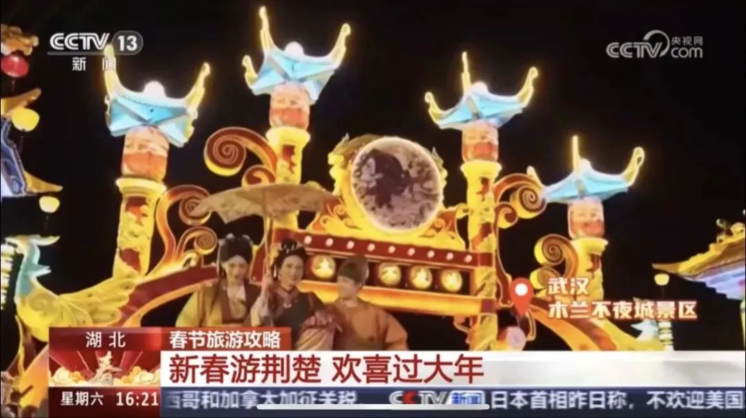 2月1日,央視新聞直播間欄目以《新春游荊楚,歡喜過大年》為題,聚焦湖北武漢鄉(xiāng)村游。解說詞說道:“武漢木蘭不夜城景區(qū),是以沉浸式夜游和木蘭文化實(shí)景演出為特色的旅游景區(qū)。春節(jié)假期,除了賞燈會(huì)、看民俗,木蘭不夜城全新打造的沉浸式劇場《楚地長歌》,為游客帶來更多元化的沉浸式打卡體驗(yàn)”。