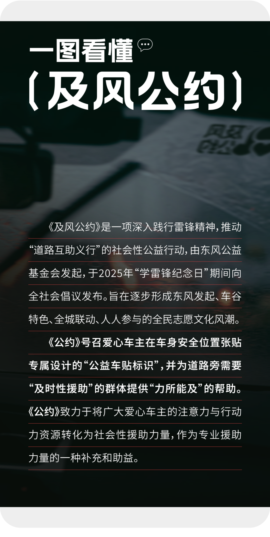 今天,我們以車輪為筆,重新書寫新時代的雷鋒日記。當千萬車主的點滴善意匯成江河,這股東風必將升騰而起,讓“及風行動”成為新時代向上向善的生動注腳!