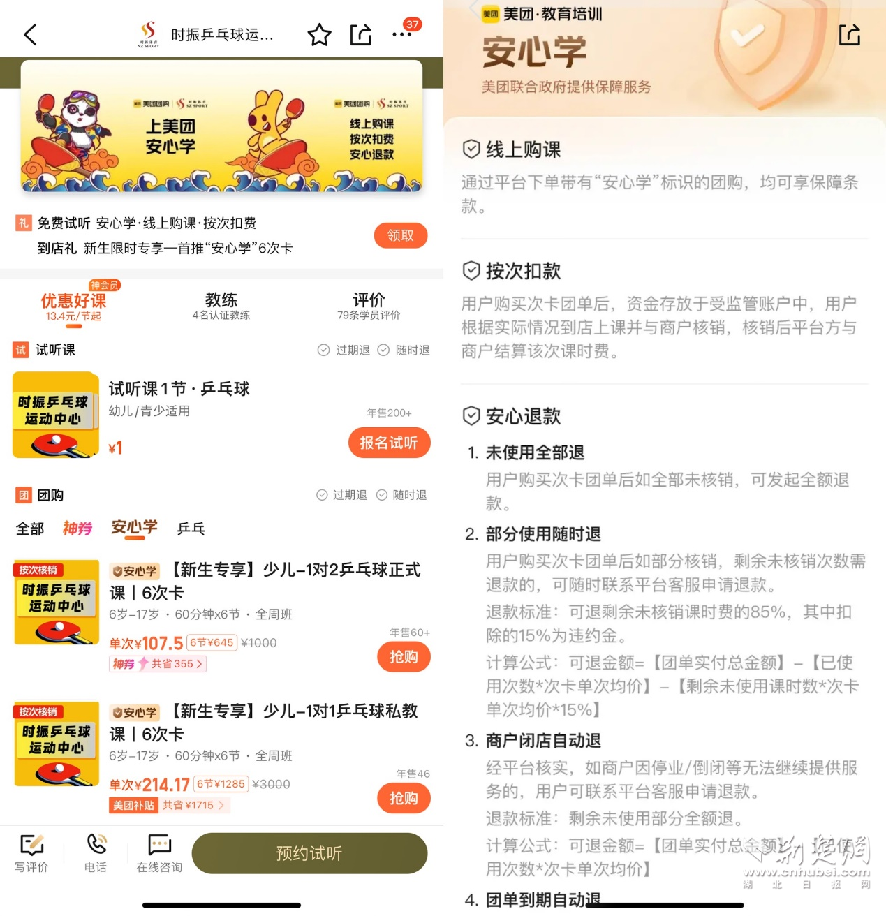 杭州時振乒乓球運動中心是第一批參與美團“安心學(xué)”的體培機構(gòu)。負(fù)責(zé)人徐振華表示,2025開年的招生過程中,最大的挑戰(zhàn)就是家長對機構(gòu)的信任度,比如在買單時,家長們比往年更為猶豫,擔(dān)心機構(gòu)是否會跑路、是否賣的是小課包等,甚至有家長詢問“是否可以一節(jié)課一節(jié)課付費”。
