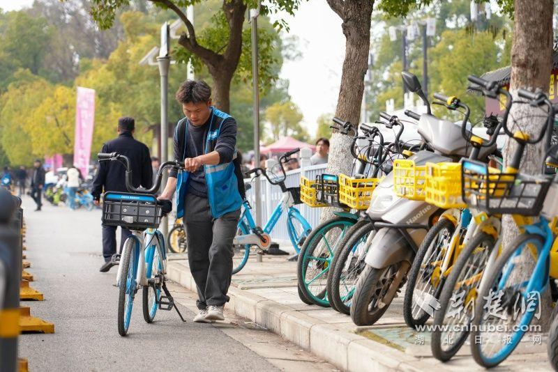 “你好,請(qǐng)往這邊有序停車(chē)。前行200米就是櫻園大門(mén),那邊不好停車(chē)?!痹隰斈ヂ窋埓渫\?chē)場(chǎng)附近,單車(chē)運(yùn)維人員正在引導(dǎo)騎行游客前往指定區(qū)域停放單車(chē)。