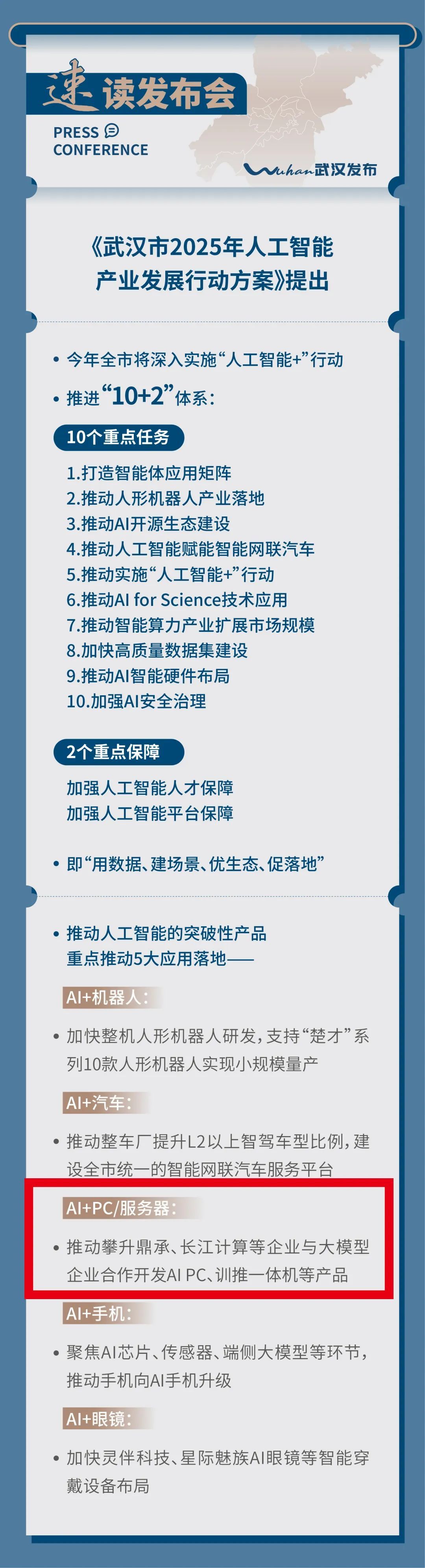 3月10日,《武漢市2025年人工智能產(chǎn)業(yè)發(fā)展行動(dòng)方案》新聞發(fā)布會(huì)召開。《行動(dòng)方案》明確將“AI+PC/服務(wù)器”列為推動(dòng)人工智能的突破性產(chǎn)品,作為五大重點(diǎn)應(yīng)用之一予以落地,并點(diǎn)名支持攀升科技等企業(yè)聯(lián)合大模型廠商,攻關(guān) AIPC等產(chǎn)品。
