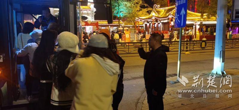 19時(shí)20 分,首輛增援公交車抵達(dá)櫻園門口。城管執(zhí)法隊(duì)員現(xiàn)場(chǎng)指揮,維持秩序,并做好解釋安撫工作,引導(dǎo)游客有序乘車。隨后,補(bǔ)充車輛接力跟進(jìn)。20時(shí)點(diǎn)30 分,最后一批游客乘上公交車,順利返程。