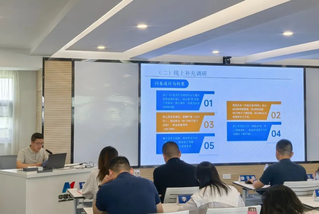 “以新需求為導向,打造‘區(qū)級核心商圈+街區(qū)融合中心+社區(qū)特色網(wǎng)點’三級聯(lián)動商業(yè)布局,全面提升居民的生活品質(zhì)。”“將科技成果轉(zhuǎn)化、團隊培養(yǎng)等指標納入A、B和C類人才動態(tài)評價體系,探索‘區(qū)內(nèi)貢獻’與‘(人才)住房資源’的權(quán)重平衡機制”。結(jié)業(yè)式上,五組學員代表分別圍繞城市更新、AI技術(shù)賦能產(chǎn)業(yè)轉(zhuǎn)型、發(fā)展現(xiàn)代服務(wù)業(yè)體系、都市近郊農(nóng)業(yè)發(fā)展路徑探索和打造人才“引育留用”服務(wù)體系等主題,詳細匯報了本組調(diào)研成果,對相關(guān)領(lǐng)域存在的問題進行深入剖析,提出了一些有借鑒意義的思考建議。