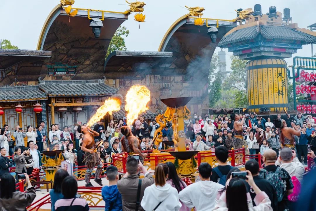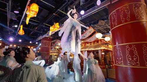 木蘭不夜城實景演繹、循環(huán)演出不間斷,噴火等絕技表演獲得了游客們的陣陣掌聲;《楚地長歌》花魁、茶鋪掌柜、店小二、浣紗女NPC街頭“飆戲”,吸引了游客朋友們互動打卡,人氣火爆。