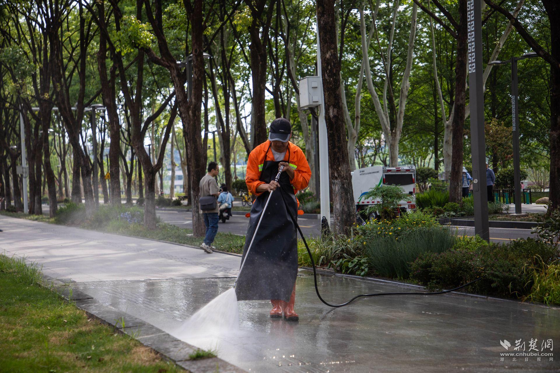 從長(zhǎng)江大橋到二環(huán)線高架,從公交站臺(tái)到匝道護(hù)欄,高壓沖洗車、吸掃車、霧炮車等1300余臺(tái)各類道路清洗作業(yè)設(shè)備各司其職;百里長(zhǎng)江生態(tài)廊道上,保潔船只繁忙穿梭;沿街各處的城市家具間,環(huán)衛(wèi)工人步履繁忙……隨著路面的灰塵、油污、泥沙、垃圾等污染物被徹底清除,廣告牌、隔音屏、燈桿、垃圾容器等城市家具被全方位擦洗,一場(chǎng)全城大清洗作業(yè)伴著破曉拉開序幕,那些穿著橙色工裝的背影,為這座城市戴上了最閃亮的勛章。