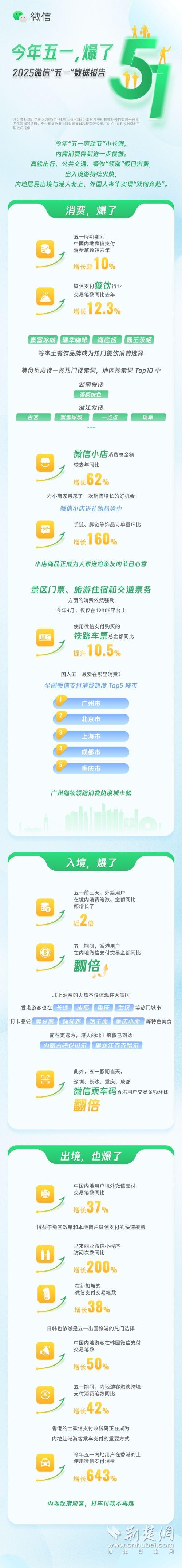 荊楚網(wǎng)(湖北日報網(wǎng))訊(通訊員 袁軒 )今年勞動節(jié)假期首次增加一天,內(nèi)需消費得到進一步提振。5月5日,微信團隊發(fā)布的2025五一數(shù)據(jù)報告顯示,假期微信支付交易筆數(shù)增長超10%,高鐵出行、公共交通、餐飲“領(lǐng)漲”假日消費,除成都、重慶、杭州外,東莞、蘇州、佛山等城市進入全國消費熱度Top 10。
