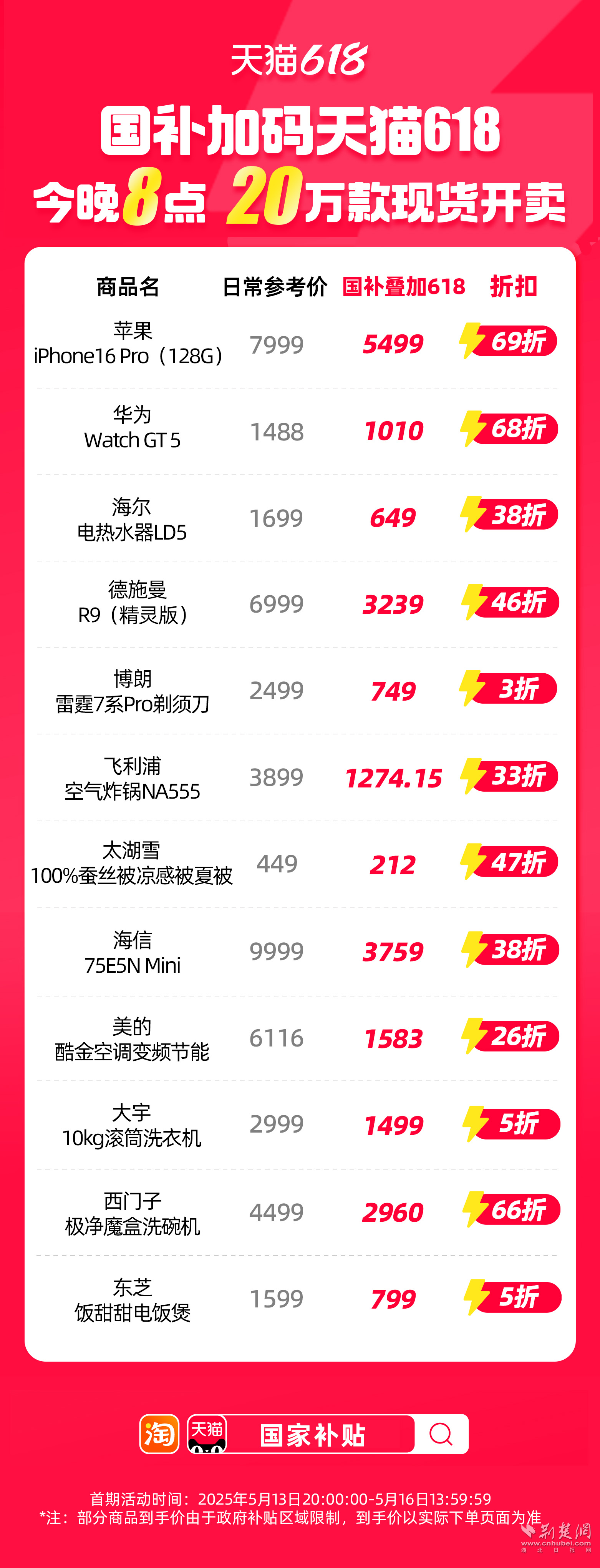 荊楚網(wǎng)(湖北日報(bào)網(wǎng))訊(通訊員 朱飛)天貓618重磅加碼國補(bǔ),家電、家裝、家居、3C數(shù)碼等品類將低至5折,今晚8點(diǎn),現(xiàn)貨開賣。