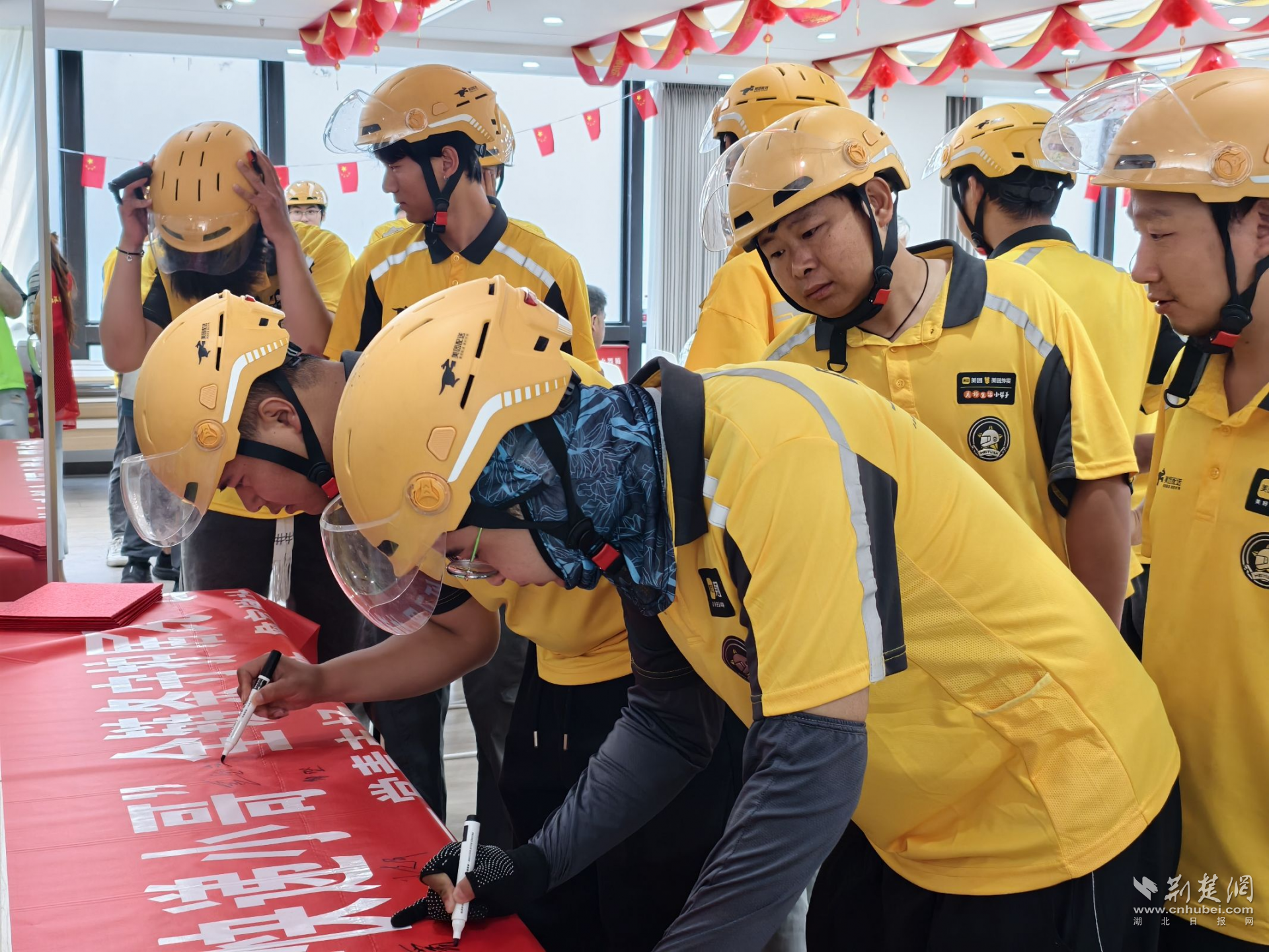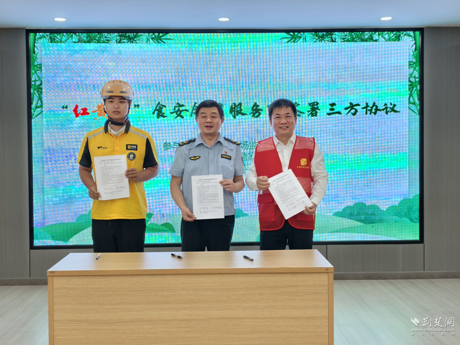 在簽約環(huán)節(jié),“紅黃藍(lán)”食安鄰里服務(wù)隊(duì)正式簽署“食安守護(hù)”共建協(xié)議,并發(fā)布食品安全倡議書?,F(xiàn)場(chǎng)還向騎手代表送上端午禮包,鼓勵(lì)他們發(fā)揮職業(yè)優(yōu)勢(shì),化身食品安全“移動(dòng)哨兵”。