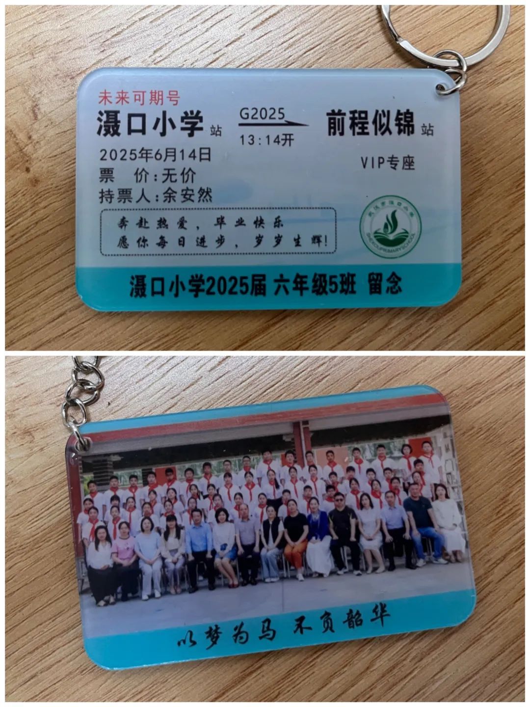 這張“火車票”不簡(jiǎn)單,是獨(dú)一無(wú)二的定制款!這趟車叫“未來(lái)可期號(hào)”,車次是G2025,從“灄口小學(xué)”站開往“前程似錦”站。發(fā)車時(shí)間特意定在6月14日13時(shí)14分,這是孩子們?cè)谛5淖詈笠惶?,意義非凡!每張票上都印著?;?,持票人是孩子們的名字。票價(jià)那一欄寫著“無(wú)價(jià)”,座位更是“VIP專座”,滿滿都是我對(duì)他們的愛和期許!