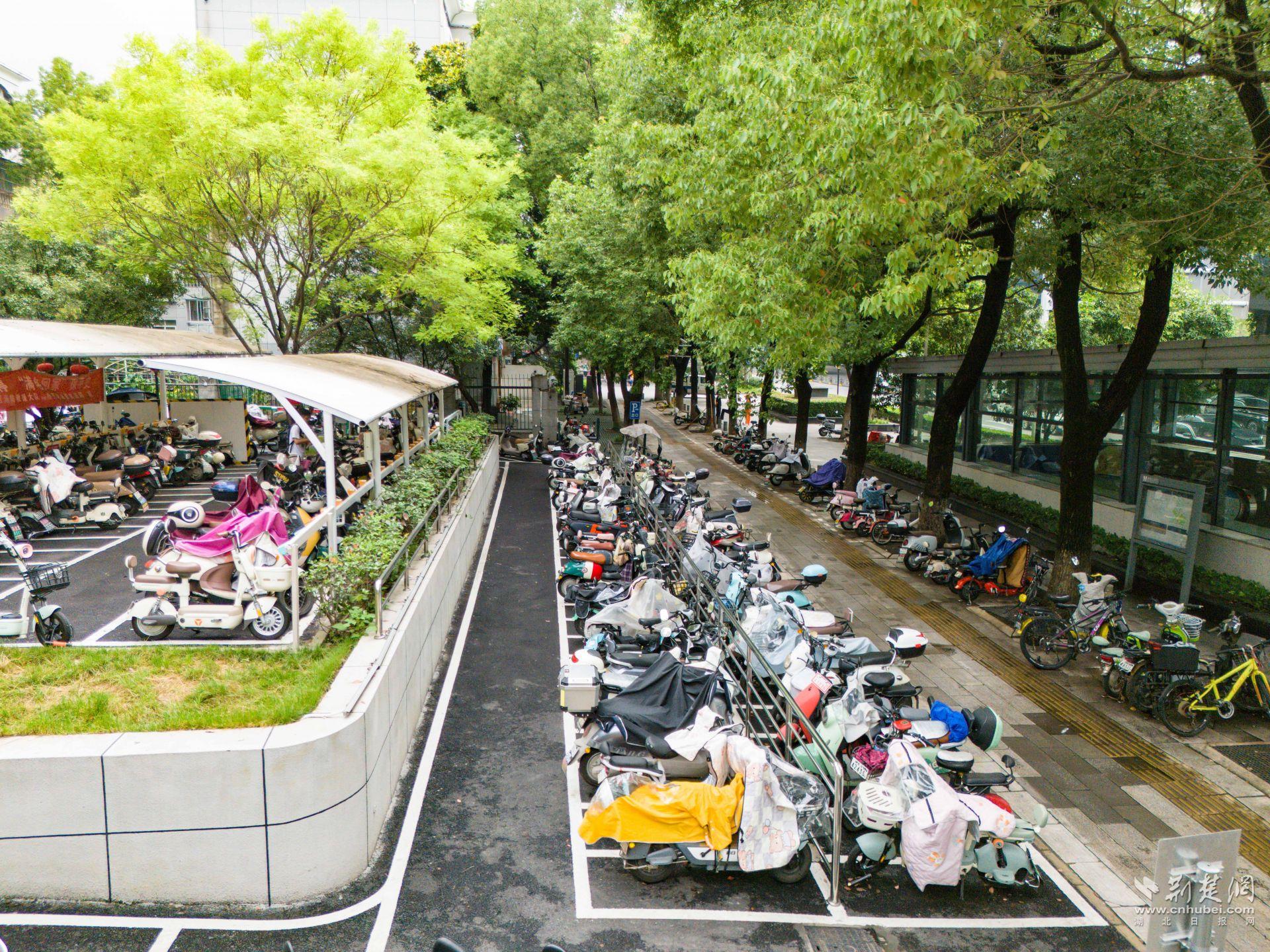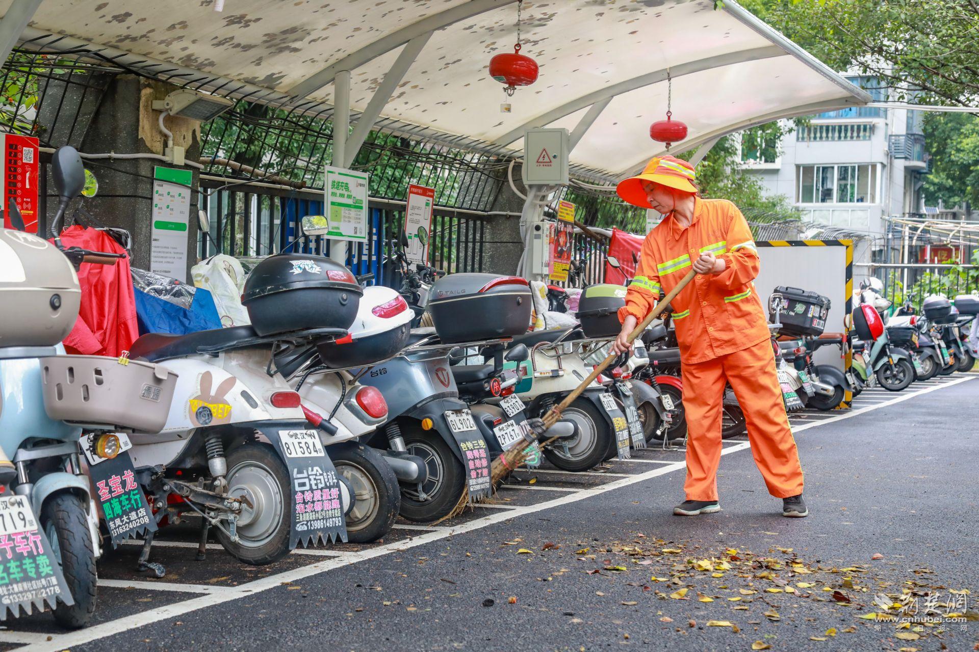 體育中心一帶人流密集,周邊高校、商圈、居民區(qū)扎堆,非機(jī)動(dòng)車保有量大,亂停亂放、私拉亂接的現(xiàn)象一度突出?!霸缤砀叻宓臅r(shí)候,電動(dòng)車能‘插’到哪就停到哪,充電線從窗戶、欄桿上扯下來,既不安全也不好管?!必?fù)責(zé)這一片區(qū)巡查的城管隊(duì)員陳強(qiáng)說,最多的時(shí)候一條路邊能擠幾十輛車。