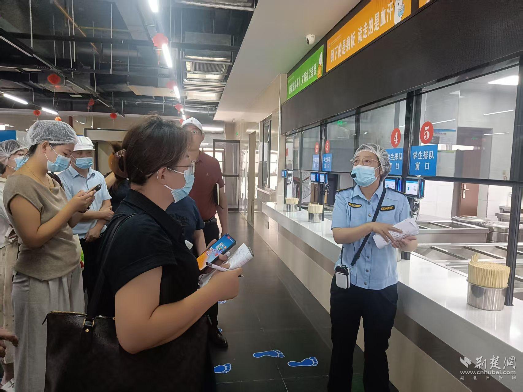 吳家山第四中學(xué)食堂內(nèi),工作人員正忙碌著為軍訓(xùn)學(xué)生做午餐。東西湖區(qū)市場監(jiān)管局餐飲科執(zhí)法人員帶領(lǐng)與會人員一邊實地觀摩,一邊現(xiàn)場授課。